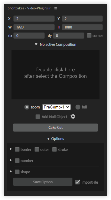 PreComp-1: هر لایه یکبار پیشکامپوز میشود (با حفظ تمام ویژگیها در Comp). سپس عرض و ارتفاع این پیشکامپوزیشن تنظیم میشود.
